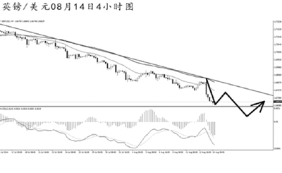 英鎊兌美元上探趨勢(shì)線阻力,隨后強(qiáng)力暴跌。從4小時(shí)圖看,匯價(jià)下跌斜率加大,再度遠(yuǎn)離了趨勢(shì)線的阻力,預(yù)計(jì)短線面臨一定的上調(diào)壓力,但整體走弱的趨勢(shì)不易發(fā)生改變。