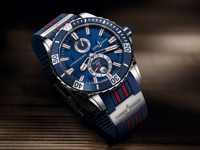 摩納哥航海潛水限量腕表的所有細節(jié)都能營造出瑞士勒洛克制表大師身處深海世界的奇幻意境。2點鐘位置清晰地展示瑞士雅典表船錨標志:藍色面盤飾有帆船圖案,而計時外圈上則配有波紋圖案。堅固的表背上刻有一只船,外圍鐫刻著「Conquer