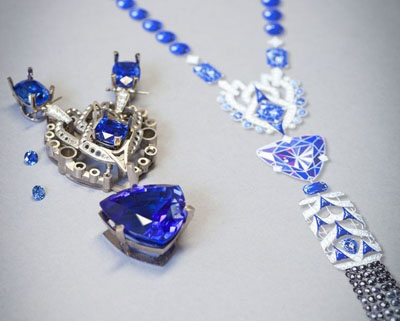 白金長項鏈,鑲嵌有公主方形切割與明亮式切割鉆石,凸圓形切割藍(lán)寶石,圓形藍(lán)寶石,珠子和青金石圖案,黑色尖晶石珠,三顆枕形切割藍(lán)寶石,一顆來自斯里蘭卡,重達(dá)4.26克拉,兩顆來自馬達(dá)加斯加,分別重4.70克拉和5.13克拉,一顆45.64克拉的三角枕型切割坦桑石。項鏈的每條穗子頂端也都鑲嵌有閃耀的鉆石,真正360度無死角的設(shè)計理念。