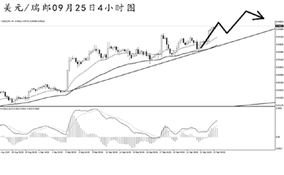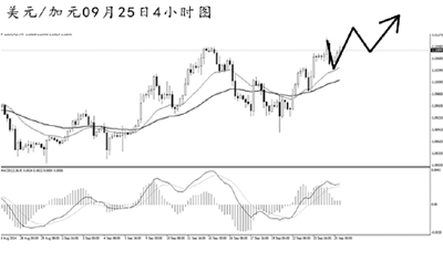 美元兌瑞郎高位盤整之后繼續(xù)強力走高。日線圖上漲斜率陡峭,由于上方近期并沒有明顯的強阻力,匯價仍有較為廣闊的沖高空間。4小時圖上升趨勢線的支撐作用完好,均線系統(tǒng)多頭排列。MACD頂背離信號明顯,但在跌破趨勢線支撐之前,需繼續(xù)抱以看漲的思路,首要目標0.9650一線。