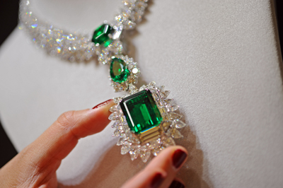 10月1日,在新加坡,一名模特在展示綠寶石套件。當(dāng)日,新加坡珠寶節(jié)舉行預(yù)展。珠寶節(jié)將于10月17日至26日舉行。