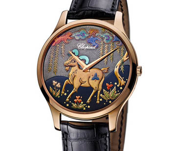 XP腕表。十二生肖中藝術(shù)性最高的山羊造型在面盤上精致呈現(xiàn),表殼內(nèi)更搭載蕭邦自制的L.U.C超薄機(jī)芯。