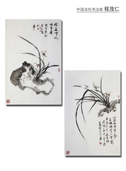 老四程茂仁,1947年生于北京,自幼受家庭的熏陶,隨父習(xí)畫。后又受教于著名書法家黃高漢先生,臨習(xí)《柳公權(quán)玄秘塔》、《顏真卿多寶塔》等碑帖,并得其父好友蕭勞、王遐舉先生的教誨,走上了學(xué)習(xí)書法之路。為了更好地學(xué)習(xí)和交流書法藝術(shù),1998年退休后,他從山東回到北京,專心致志搞書法;氐奖本┖,他遍訪北京書法名家,虛心求教,廣泛交流,受益頗多。2002年,又拜歐陽中石先生為師,得到先生的親自教誨,更使其書法平添了幾多神韻。