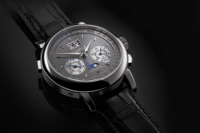 Perpetual的特色之一,這次更搭配18K黃金鍍銠棒形小時刻度、時針和分針。計時指針顯示出準(zhǔn)確至五分之一秒的停動時間,并由藍(lán)鋼打造而成。積分盤和秒針亦選用了相同材質(zhì),在小表盤的銀灰色背景上格外醒目。由556個精細(xì)零件組成的機(jī)芯,進(jìn)一步印證了來自薩克森的朗格表廠在復(fù)雜制表裝置領(lǐng)域的精湛技藝。