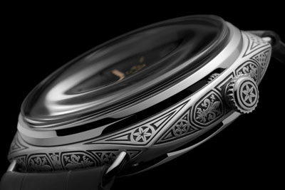 不銹鋼極為堅硬,因此每處表殼的鐫刻工序需工匠耗時逾一周方可完成。工匠首先以白堊粉與鎂粉描出幾何與百合圖案,再以刻刀細(xì)心雕刻?碳y幼細(xì)對稱,展現(xiàn)細(xì)致質(zhì)感,勾勒光影對比。此項工序于加工完成的表殼上進行,因此工匠的分毫失誤均將破壞前段工序的心血,就如同雕刻家若意外發(fā)生細(xì)微失誤,即需重頭再次雕琢。