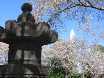湖畔林中,水光瀲滟、樹影婆娑。在1912年由兩位夫人手植的兩株櫻樹附近,有一石燈及一石塔,均系花崗巖材質(zhì)。燈矮塔高,皆是來自日本的古物。九重檐佛塔兩米多高,塔上蓮花和櫻花圖案依稀可辨,但祭奠文字早已模糊不清。具體年代不詳,屬于鐮倉時代的典型禪宗藝術風格。佛教西來東土,在中國被改良成本土禪宗。南宋時,禪宗傳入日本。石燈高一米多,原立于東京寬永寺內(nèi)。它造于1651年(順治八年),是為祭奠去世的日本德川幕府第三代將軍家光,其祖父即赫赫有名的德川家康。一對石燈,一在華盛頓,一在上野公園內(nèi)的寛永寺遺址。1945年的東京大轟炸導致大火,寺毀燈存。