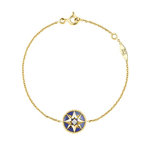 Vents(羅盤玫瑰)系列正是基于這些故事的靈感之作!拔易畛踉O(shè)想的是一枚小小的圖案吊墜,后來我覺得設(shè)計(jì)成圓形圖案的徽章樣式更具紀(jì)念意義。”這位迪奧高級(jí)珠寶部藝術(shù)總監(jiān)如是說!八笳髀眯校渲刑N(yùn)含著克里斯汀·迪奧的星星和那段幸運(yùn)符的故事,同時(shí)包含了迪奧先生最愛的玫瑰花元素。品牌的歷史精髓都隱含在其中。”由黃金和珍珠母貝、青金石或綠松石、玫瑰金和粉色蛋白石精心打造,這些美輪美奐的珠寶仿佛在輕訴品牌的傳奇故事。圓形徽章圖案周圍飾有一圈金色稻穗,旨在向帆纜和大海致敬。吊墜一面為寶石,一面為羅盤玫瑰圖案,正反面隨著佩戴者的舉手投足交替顯現(xiàn)。圍繞同主題打造的手鏈和長(zhǎng)短款項(xiàng)鏈,大大豐富了這一系列的選擇!癛ose
