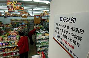石家莊一家便利店內(nèi)張貼著“不出售一粒假藥”的承諾。本報(bào)記者 鞏志宏 攝