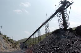 這是山西一家煤礦運輸皮帶從礦井口運出的煤炭。