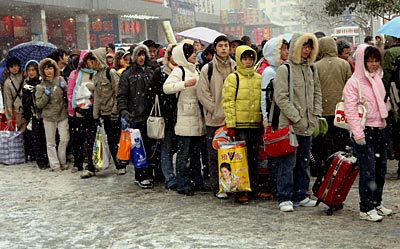 一年的牽掛,系于一張車票。 1月13日晚上,上海迎來了2008年的第一場雪。不少準備春節(jié)回家的人,為了能買到一張“回鄉(xiāng)票”,不得不通宵排隊。 在上海南站售票處,來自貴州銅仁的一位19歲打工妹說:“已經(jīng)通宵排了兩天了,昨天早上8點被告知沒票,就回宿舍睡了一覺,傍晚再過來排隊時,發(fā)現(xiàn)前面又有近20人了。聽說原來排在前面的400多人都發(fā)到了排隊預(yù)約票,真后悔回去睡了一覺!” 在排隊的長龍里,有一個乍看很是臃腫的人格外引人注意,上前一看,原來是一對農(nóng)民工夫婦為了取暖而緊緊相擁,用兩人的衣服包裹在一起驅(qū)寒。 15日下午,上;疖囌韭(lián)合售票大廳一樓。“晚上我們就準備睡在售票大廳!币讶隂]回家的王師傅說,他幾天前從杭州趕來上海,為自己和工友購買由上海至四川廣元、成都的火車票,已經(jīng)在售票大廳度過了三個晚上。 王師傅說,來了三天還是沒能買到票,得怪自己“失誤”:原以為排隊買次日的車票肯定沒有問題,不料晚上來到售票大廳,發(fā)現(xiàn)前面已排有十多個人,輪到自己時,票已售完。吸取教訓后,王師傅白天不敢隨便走動,午飯和晚飯就讓別人幫忙帶點盒飯,到第二天早上,終于買到了五張站票。 連日來,火車站售票處人頭攢動,絕大多數(shù)都是準備買票回鄉(xiāng)的農(nóng)民工。對于睡在地上的許多人來說,他們心中的天堂就是夢鄉(xiāng),就是家鄉(xiāng)。