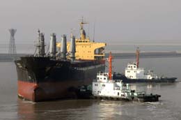 在河北黃驊港,一艘貨輪在拖輪的輔助下靠岸。 | 南方大部地區(qū)持續(xù)不斷的雪災(zāi)、冰災(zāi),使得電煤供應(yīng)成為重大難題。而在北煤南運(yùn)的這一鏈條中,地處冀東的黃驊港擔(dān)負(fù)著東南5省1市電煤運(yùn)輸重任。由于特殊的地理位置,黃驊港形成了我國最長的人工單向航道,自然災(zāi)害多,安全隱患突出,這也使得這一能源港“牽一發(fā)而動全身”。 作為主管轄區(qū)海上交通安全的河北省黃驊海事局,逐步建立起一整套新型海事安全監(jiān)管新機(jī)制,實(shí)現(xiàn)沿海港口聯(lián)合安全調(diào)度,實(shí)行強(qiáng)制引航和定點(diǎn)護(hù)航,自主研發(fā)對進(jìn)港船舶和船長實(shí)施安全評估的軟件系統(tǒng),量化安全指標(biāo)等。曾經(jīng)在港口開航當(dāng)天就發(fā)生船舶擱淺事故的黃驊港,三年來實(shí)現(xiàn)了“萬船進(jìn)出港,無一艘擱淺”的目標(biāo),確保了北煤南運(yùn)安全無虞。