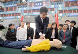 3月24日,北京急救醫(yī)療培訓(xùn)中心急救導(dǎo)師陳志在做急救示范(左圖)。當(dāng)日,來自北京地區(qū)的五十多家共100多名博物館工作人員參加了培訓(xùn)。新華社記者:羅曉光