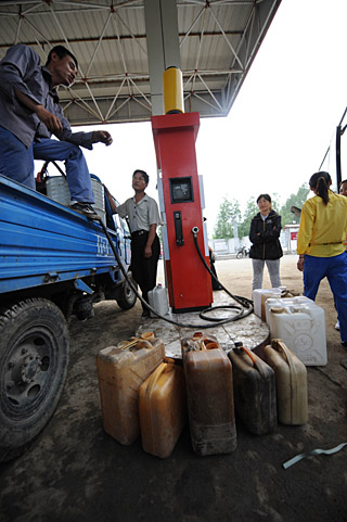 | 幾戶農(nóng)民在拿著大大小小的油桶在黑龍江省方正縣高號加油站加柴油。本報記者