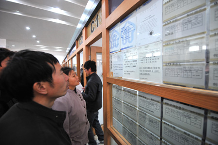 農(nóng)民工正在杭州市外來勞動(dòng)力服務(wù)中心仔細(xì)查看招工信息。本報(bào)記者:傅丕毅