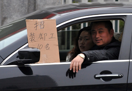 一名企業(yè)主開著私家車招農(nóng)民工。本報(bào)記者:傅丕毅