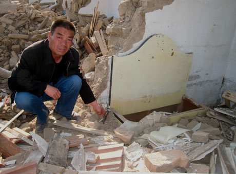 呼和浩特市玉泉區(qū)堿灘村一位村民手抓廢墟中的茶幾腿說,自家房屋于2009年4月13日凌晨被強(qiáng)行拆除時(shí),床、柜等不少用品被埋。