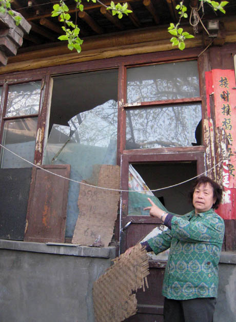 呼和浩特市玉泉區(qū)堿灘村93號(hào)居民馬彩欣指著自家破爛的門窗說,去年冬天以來有人一直威逼他們拆遷房屋,門窗玻璃經(jīng)常在深夜被人用石頭砸破。無奈之下,家人以席片、木板等阻擋,過著擔(dān)驚受怕的日子。本報(bào)記者 賈立君 攝