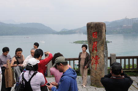 一群來自上海的游客在臺灣“日月潭”字碑前排隊留影。新華社記者 余福卿 攝