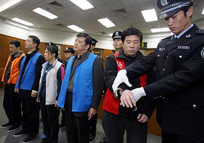 12月17日,法警在給霍民戴手銬。當日,北京市第一中級人民法院判處非法獲得貸款3億多元的主犯霍民無期徒刑。2003年6月至2005年2月,北京一公司的法人代表霍民,指使該公司人員采取冒用他人名義、隱瞞貸款實際用途、出具虛假首付款收據等手段進行詐騙,從農業(yè)銀行昌平支行非法獲得貸款3億多元。