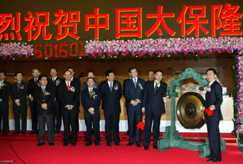 自1979年國內(nèi)恢復(fù)保險業(yè)務(wù)至今,我國保險市場規(guī)模增長了2000多倍,成為新興保險大國。圖為中國太平洋保險(集團)公司董事長高國富(右一)為A股股票上市鳴鑼。新華社發(fā) |