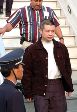 2004年4月16日,犯罪嫌疑人、原中國銀行廣東省開平支行行長余振東被美國警方押送回北京首都國際機(jī)場時(shí)走下飛機(jī)。新華社記者 袁滿