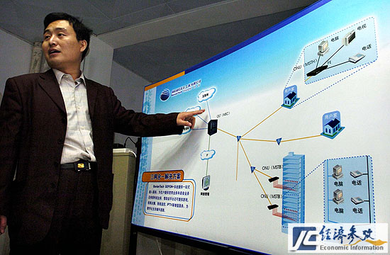 在建設(shè)部授予“全國(guó)數(shù)字社區(qū)示范工程”稱號(hào)的江蘇鎮(zhèn)江恒美嘉園光纖到戶項(xiàng)目現(xiàn)場(chǎng),工作人員在介紹光纖到戶、三網(wǎng)融合示意圖。2005年,該光纖駐地網(wǎng)就全面開通,覆蓋用戶1000多家。資料照片 |