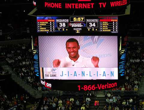畢竟,你讓場邊的NBA美女啦啦隊員隨著舞龍舞獅的節(jié)奏起舞,就像S.H.E.在《中國話》里唱的“柏林來的沃夫?qū)煤倥渲娂蹦菢臃床罹薮蟆T谇蛸愰g隙,播放了一段奇才隊隊員拼寫易建聯(lián)名字漢語拼音的視頻,逗得全場觀眾大樂,因為能拼對的隊員寥寥無幾。