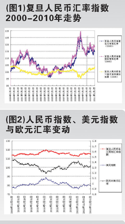 事實(shí)上,2010年復(fù)旦人民幣名義有效匯率指數(shù)和實(shí)際有效匯率指數(shù)波動(dòng)呈現(xiàn)為兩個(gè)明顯的上升和下降階段;盯住一籃子貨幣模擬指數(shù)則呈現(xiàn)緩慢平穩(wěn)上升趨勢(shì)。