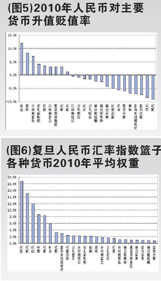 2010年復(fù)旦人民幣匯率變動(dòng)主要受歐元、美元、日元、港元、澳元等貨幣變動(dòng)的影響。圖5顯示了2010年人民幣對(duì)24種主要貨幣升值貶值情況。人民幣對(duì)歐元升值最大,達(dá)11.84%,其次為英鎊8.18%;對(duì)澳元貶值最大為9.1%,其次為日元8.4%。