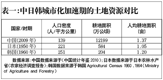 Report——2008revision數(shù)據(jù))?紤]到我國(guó)西部很多地區(qū)無(wú)法耕種和不宜居住的因素,從人均耕地面積上看,日本與韓國(guó)人均耕地面積在二戰(zhàn)后城市化起步期大致為人均1畝出頭,略低于我國(guó)目前人均耕地面積1.37畝,后來(lái)由于戰(zhàn)后人口快速增長(zhǎng)和城市化占地,現(xiàn)在都均為約0.6畝,不到我們的一半。如果說(shuō)我們?nèi)丝诿芏雀呷司孛娣e少,那么日韓兩國(guó)的自然稟賦顯然比中國(guó)要更差一些(見(jiàn)表一)。