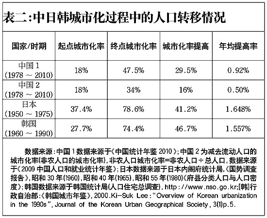 日、韓兩國(guó)在二戰(zhàn)結(jié)束后,均經(jīng)歷了我們現(xiàn)在面臨的城市化過(guò)程,而且速度都遠(yuǎn)超中國(guó)。日本從1950年的城市人口占全國(guó)總?cè)丝诒戎?7.4%,至1975年達(dá)到了78.6%,25年間轉(zhuǎn)移了全國(guó)總?cè)丝诘?1.2%,基本實(shí)現(xiàn)城市化。其中人口移動(dòng)集中期的50年代末至70年代初(1957-1973)的15年中,全國(guó)總?cè)丝诘?8%從農(nóng)村和中小城市移住到中心城市圈;韓國(guó)從1960年至1990年30年間,城市人口占總?cè)丝诒戎貜?7.7%增長(zhǎng)到74.4%,增加了46.7%,其中僅1960-1970年的10年中,就有占全國(guó)總?cè)丝?7%的居民從農(nóng)村移住城市地區(qū)。日、韓兩國(guó)由于先后分別在30年左右的時(shí)間內(nèi)完成了城市化轉(zhuǎn)型,而且均沒(méi)有留下城市貧民窟等后遺癥,因而成為20世紀(jì)中期以來(lái)順利避免了中等收入陷阱、進(jìn)入發(fā)達(dá)經(jīng)濟(jì)體的兩個(gè)成功案例(日本2010年人均GDP為4萬(wàn)多美元,成為高度發(fā)達(dá)國(guó)家,韓國(guó)2010年人均GDP已達(dá)2萬(wàn)多美元,成為新興發(fā)達(dá)國(guó)家的領(lǐng)軍角色。在上世紀(jì)末完成城市化時(shí),城鄉(xiāng)差距不大,收入分配相當(dāng)平等,兩國(guó)的基尼系數(shù)均低于0.3,屬亞洲國(guó)家中的最好水平,也優(yōu)于美國(guó)和大多數(shù)西歐國(guó)家)。中國(guó)自1978年改革開(kāi)放、特別是1990年以來(lái),隨著經(jīng)濟(jì)的高速增長(zhǎng)和國(guó)家工業(yè)化的突飛猛進(jìn),也進(jìn)入了城市化的加速發(fā)展期。城市化率從1978年的18%上升到2010年47.5%,32年間轉(zhuǎn)移了29.5%的人口。但存在的重大缺陷是這其中還有13.5%即近2億人作為移動(dòng)人口因沒(méi)有住房無(wú)法安居。減去這些以農(nóng)民工為主的移動(dòng)人口,城市戶籍或定居人口只在34%左右。即30余年間只轉(zhuǎn)移定居了人口的16%(見(jiàn)表二)。從日本、韓國(guó)情況看,中國(guó)已進(jìn)入城市化發(fā)展的加速期。在今后20-30年內(nèi),面臨基本完成城市化即城市化率達(dá)到75%—80%的前景,這意味著到2030—2040年我國(guó)屆時(shí)15億人口中城市定居的人口要達(dá)到11億—12億,即增加6—7億人。新增人口的城市布局和安居問(wèn)題將是首要挑戰(zhàn)。因此,無(wú)論人們?nèi)绾螒?yīng)對(duì),城市化都是中國(guó)人在這個(gè)時(shí)代不得不面對(duì)的最主要的社會(huì)和經(jīng)濟(jì)結(jié)構(gòu)轉(zhuǎn)型。