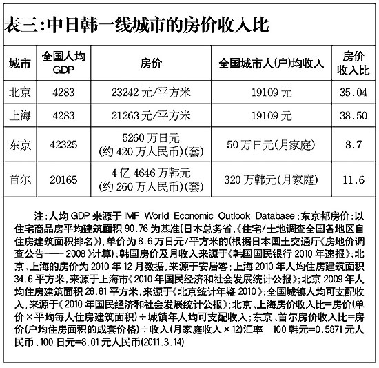 從人口分布看,日本與韓國(guó)都是以大都市為中心的人口分布格局。其中日本占全國(guó)面積12%的三大都市圈集中了全國(guó)50%以上人口;韓國(guó)以首爾為中心的首都圈面積為國(guó)土的0.6%,人口接近全國(guó)人口的20%,而全國(guó)8個(gè)百萬(wàn)人口以上的大城市聚集了全國(guó)一半以上的人口。雖然城市化過(guò)程中的大規(guī)模人口移動(dòng)和人口向中心城市地區(qū)的高度集中,給日、韓兩國(guó)帶來(lái)了巨大的城市住房安置壓力,但這兩個(gè)國(guó)家均較好地消化了大量集中進(jìn)城的外來(lái)人口,而且較好地調(diào)控了樓市,使房?jī)r(jià)一直處在工薪階層能夠負(fù)擔(dān)的范圍內(nèi)。如2008年,日本東京市內(nèi)23區(qū)(相當(dāng)于北京的三環(huán)內(nèi)。整個(gè)東京圈由都內(nèi)23區(qū)、都轄27市和周邊4縣構(gòu)成)的平均房?jī)r(jià)為78.6萬(wàn)日元/平方米(相當(dāng)于我國(guó)包括公攤面積的每建筑平方米5萬(wàn)多元人民幣,不區(qū)分新房、二手房),約為全日本城市家庭平均月收入50萬(wàn)日元的1.6倍,東京都的平均房?jī)r(jià)(基本相當(dāng)北京5環(huán)以內(nèi))為57.4萬(wàn)日元/平方米,約為城市家庭月收入的1.14倍。以日本東京都商品住宅平均每套價(jià)格約5260萬(wàn)日元折合近420萬(wàn)元人民幣為例,約為日本城市家庭平均年收入的8.77倍。房子絕對(duì)價(jià)格高,但相對(duì)家庭收入比來(lái)看,可以承受;韓國(guó)雖然人口過(guò)于向首爾集中,中等收入家庭也能負(fù)擔(dān)購(gòu)房費(fèi)用。韓國(guó)國(guó)民銀行2010年速報(bào)顯示,首爾普通住宅平均價(jià)4億4646萬(wàn)韓元(約230萬(wàn)人民幣),為韓國(guó)城市家庭平均年收入3830萬(wàn)韓元的11.3倍。