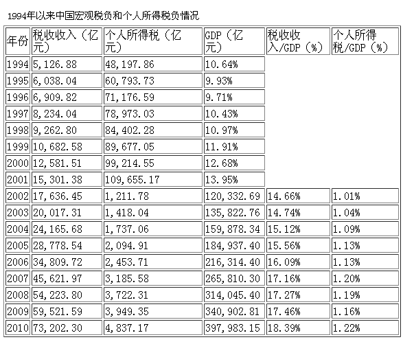 (2)過(guò)去10年,名義GDP平均每年增長(zhǎng)15%,2010年GDP比2000年翻了兩番,但費(fèi)用扣除和稅率級(jí)距卻沒(méi)有相應(yīng)調(diào)整,其結(jié)果是工資、薪金實(shí)際稅負(fù)逐年加重。