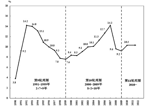 新中國(guó)成立以來,從1953年開始大規(guī)模經(jīng)濟(jì)建設(shè)、進(jìn)入工業(yè)化歷程到2009年,經(jīng)濟(jì)增長(zhǎng)率(國(guó)內(nèi)生產(chǎn)總值增長(zhǎng)率)的波動(dòng)共經(jīng)歷了10輪周期,2010年又進(jìn)入了新一輪即第十一輪周期。
