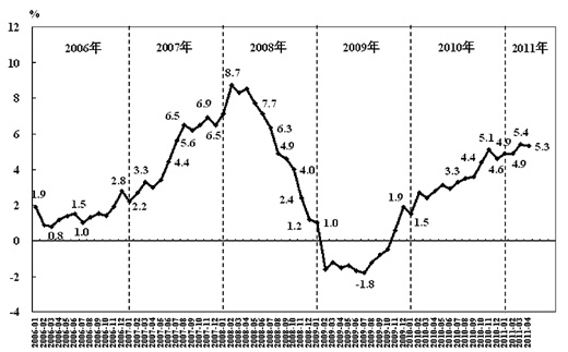 圖2 居民消費(fèi)價(jià)格月同比上漲率(2006年1月—2011年4月)