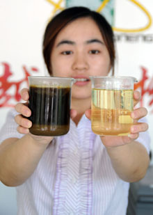 目前,各地仍在為“地溝油”回流餐桌傷透腦筋,而國(guó)家級(jí)重點(diǎn)高新技術(shù)企業(yè)——福建龍巖卓越新能源發(fā)展有限公司利用自主研發(fā)的新技術(shù)和連續(xù)自動(dòng)生產(chǎn)設(shè)備,從1噸“地溝油”中提煉出980公斤的清潔液體燃料——生物柴油。圖為廈門卓越生物質(zhì)能源有限公司工作人員用玻璃燒杯向記者展示了一杯原料“地溝油”(左)和一杯成品生物柴油(右)。記者