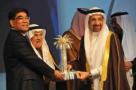 1月14日,在沙特阿美公司總部,阿美公司總裁和首席執(zhí)行官哈立德(右)和中石化董事長(zhǎng)傅成玉(左)向沙特石油和礦產(chǎn)資源大臣納伊米(中)贈(zèng)送紀(jì)念品。當(dāng)天,中國(guó)石油化工集團(tuán)公司(中石化)和沙特國(guó)家石油公司(沙特阿美)簽署了合資在沙建煉油廠的協(xié)議。根據(jù)協(xié)議,兩大公司合作在沙特西部沿海城市延布(yanbu)建設(shè)一座煉油廠,總投資接近100億美元。沙特阿美將持有62.5%的股份,中石化持有剩余股份。新華社發(fā)(記者