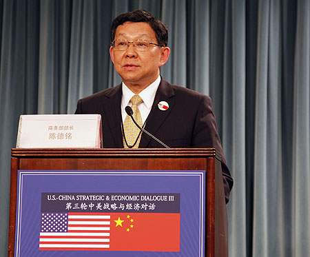 2011年5月9日,在美國(guó)首都華盛頓,中國(guó)商務(wù)部部長(zhǎng)陳德銘在第三輪中美戰(zhàn)略與經(jīng)濟(jì)對(duì)話舉行期間召開(kāi)新聞發(fā)布會(huì)。 陳德銘呼吁美國(guó)放寬對(duì)華出口限制,并為中國(guó)企業(yè)赴美投資創(chuàng)造良好的環(huán)境。資料照片 |