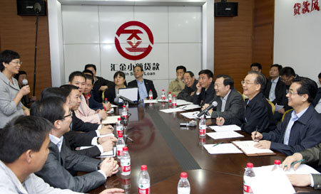 2011年10月,國務(wù)院總理溫家寶來到浙江紹興和溫州,深入農(nóng)村、社區(qū)、企業(yè)和市場,看望廣大干部群眾,就經(jīng)濟運行情況進行調(diào)研。 圖為溫家寶在紹興縣匯金小額貸款公司考察,詳細(xì)詢問小額貸款公司和民間信貸的情況,認(rèn)真聽取大家的意見和建議。(資料照片) |