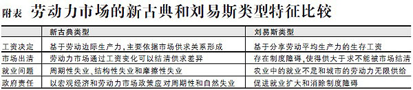 中國(guó)勞動(dòng)力市場(chǎng)正在從二元經(jīng)濟(jì)所對(duì)應(yīng)的模式轉(zhuǎn)向與新古典經(jīng)濟(jì)相對(duì)應(yīng)的模式,勞動(dòng)力市場(chǎng)的表現(xiàn)既存有二元經(jīng)濟(jì)特征又表現(xiàn)出一定的新古典模式特點(diǎn)。因此,在認(rèn)識(shí)二元經(jīng)濟(jì)下勞動(dòng)力市場(chǎng)性質(zhì)的基礎(chǔ)上,也需要把握新古典模式下的勞動(dòng)力市場(chǎng)的相關(guān)特征,因?yàn)檫^(guò)去階段的一些特征仍然存在,而后者在一定程度上也是轉(zhuǎn)型的目標(biāo)所指。我們可以嘗試借鑒這兩種分析框架來(lái)認(rèn)識(shí)當(dāng)前問(wèn)題。我們先把新古典模式的勞動(dòng)力市場(chǎng)與劉易斯勞動(dòng)力市場(chǎng)類型進(jìn)行對(duì)比(見(jiàn)附表)。通過(guò)對(duì)比,我們可以了解,當(dāng)前我們的勞動(dòng)力市場(chǎng)特征既不是純粹的二元經(jīng)濟(jì)結(jié)構(gòu),也不是典型的新古典模式。