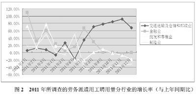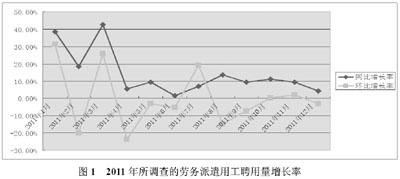1.與上年同期相比,2011年所調(diào)查的勞務(wù)派遣用工聘用量有明顯的增長(zhǎng),但增速有小幅下滑。