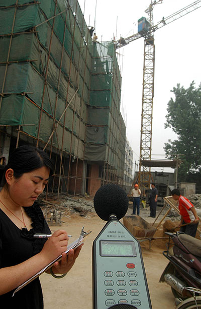 環(huán)保執(zhí)法人員在建筑工地進(jìn)行噪聲監(jiān)測,對違規(guī)施工、噪聲超標(biāo)的單位進(jìn)行處罰。資料照片 |