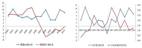 其次,兩者的變動(dòng)方向可能完全相反。2000-2012年,美國(guó)、日本的房?jī)r(jià)增速與M2增長(zhǎng)都是負(fù)相關(guān)關(guān)系(-23%、-40%)。2007-2012年,美國(guó)M2年均增速達(dá)6.8%,比前六年的平均增速高0.6個(gè)百分點(diǎn),而房?jī)r(jià)卻連續(xù)六年下降,年均增速比前六年低10.6個(gè)百分點(diǎn)。