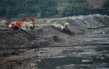 據(jù)2013年河北省環(huán)境狀況公報(bào),河北省河流水質(zhì)總體為中度污染,七大水系中,永定河水系和灤河水系為輕度污染,大清河水系和北三河水系為中度污染,漳衛(wèi)南運(yùn)河水系、子牙河水系和黑龍港運(yùn)東水系為重度污染。 圖為6月4日,工人們?cè)诤颖笔∨d隆縣境內(nèi)的柳河邊進(jìn)行清淤疏浚!∮浾