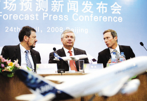| 4月24日,空中客車公司客戶事務首席運營官雷義(中)、空中客車公司市場預測與研究副總裁勞倫·羅奧(右)和空中客車中國公司總裁博龍在2007—2026年全球航空市場(中國)預測發(fā)布會上。