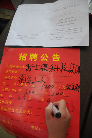 河南南陽市臥龍區(qū)人力資源市場(chǎng)的工作人員抄寫富士康招聘公告。付海厚