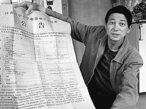 圖為沙振明在展示《河南省中小學(xué)收費(fèi)項(xiàng)目及標(biāo)準(zhǔn)公告》。曲昌榮 攝