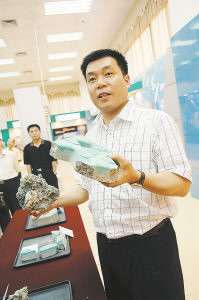 陳澤峰在展示豐泉環(huán)保的垃圾處理產(chǎn)品。趙晶攝 |