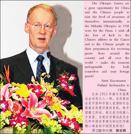 對芬蘭的體育發(fā)展狀況,郭安琪大使介紹說,芬蘭人熱愛運動,甚至對體育有點著迷,他們都會將很多閑暇時間用于某種或某些體育運動。體育的流行也提高了芬蘭奧運會和其它國際競技體育的成績,政府大力支持廣泛開展群眾體育運動和加強年輕人學校體育教育。芬蘭人口基數(shù)不大,只有500多萬人,對于芬蘭的運動員來說,參加今天規(guī)模宏大,高手云集的奧運會,取得好成績的確是個挑戰(zhàn),但是,郭安琪大使說芬蘭優(yōu)秀的運動員使國民對在北京奧運會上取得獎牌充滿信心。就郭安琪大使本人的判斷,他認為具體來說,芬蘭運動員非常有希望在標槍、射擊、摔跤、游泳項目上取得好成績,盡管他不是體育專家。