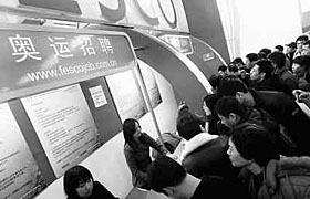 2月17日開(kāi)幕的2008年北京春季招聘會(huì)首次設(shè)立了奧運(yùn)專(zhuān)場(chǎng),部分奧運(yùn)供應(yīng)商、服務(wù)商現(xiàn)場(chǎng)攬才。其中,一家中介機(jī)構(gòu)為外資企業(yè)在奧運(yùn)期間招聘400名司機(jī),打出了最高8000元的月薪。吳長(zhǎng)青/攝 |